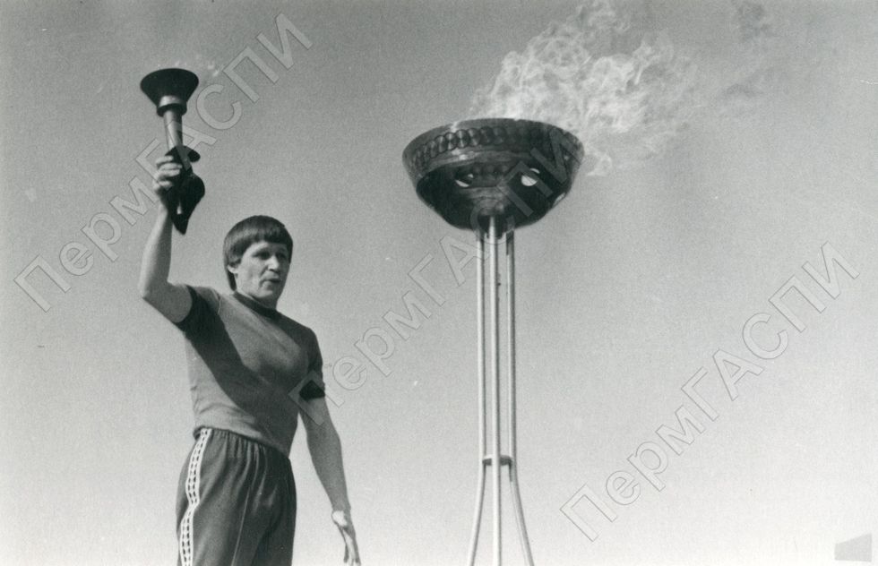 Легкоатлетическая эстафета на приз газеты "За прогресс". Г. Семенов зажигает огонь эстафеты. Стадион "Молния"