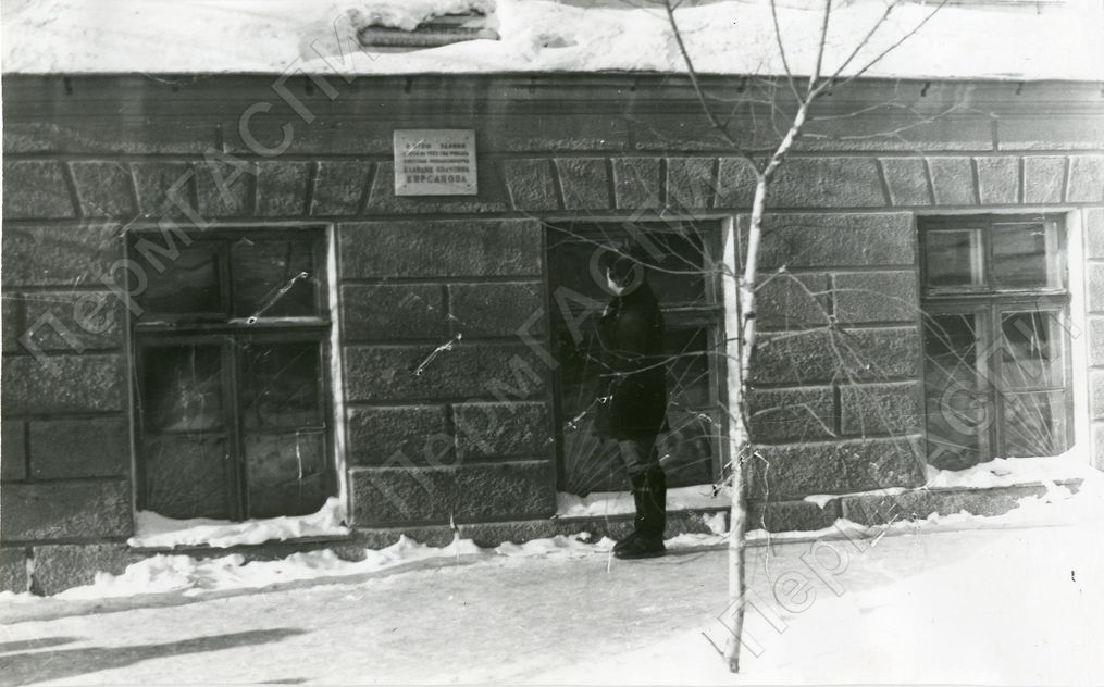 Секретарь ЗК ВЛКСМ ПО "Искра" С. Захаров осматривает мемориальную доску. Агитпробег в Суксунский р-н