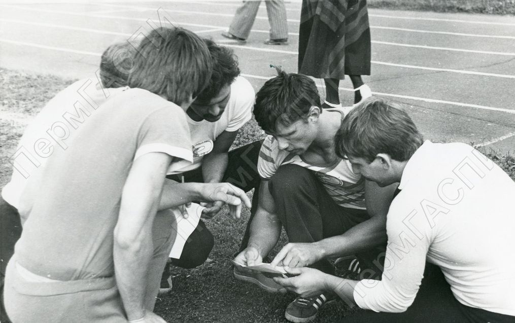 Команда ткацкой фабрики № 1 на конкурсе "А ну-ка, парни!" на задании "Эрудит". Стадион комбината шелковых тканей