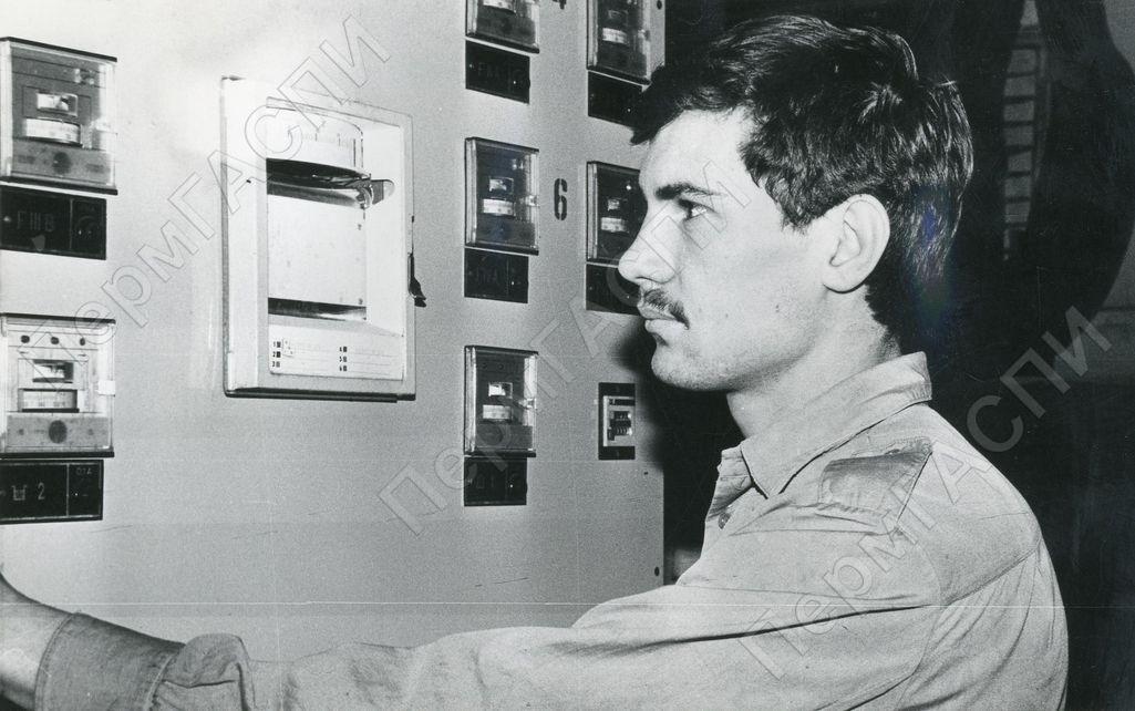 Помощник мастера Малых Вадим проверяет температурный режим отделочного агрегата. Аппретурный цех ОП-2. Комбинат шелковых тканей
