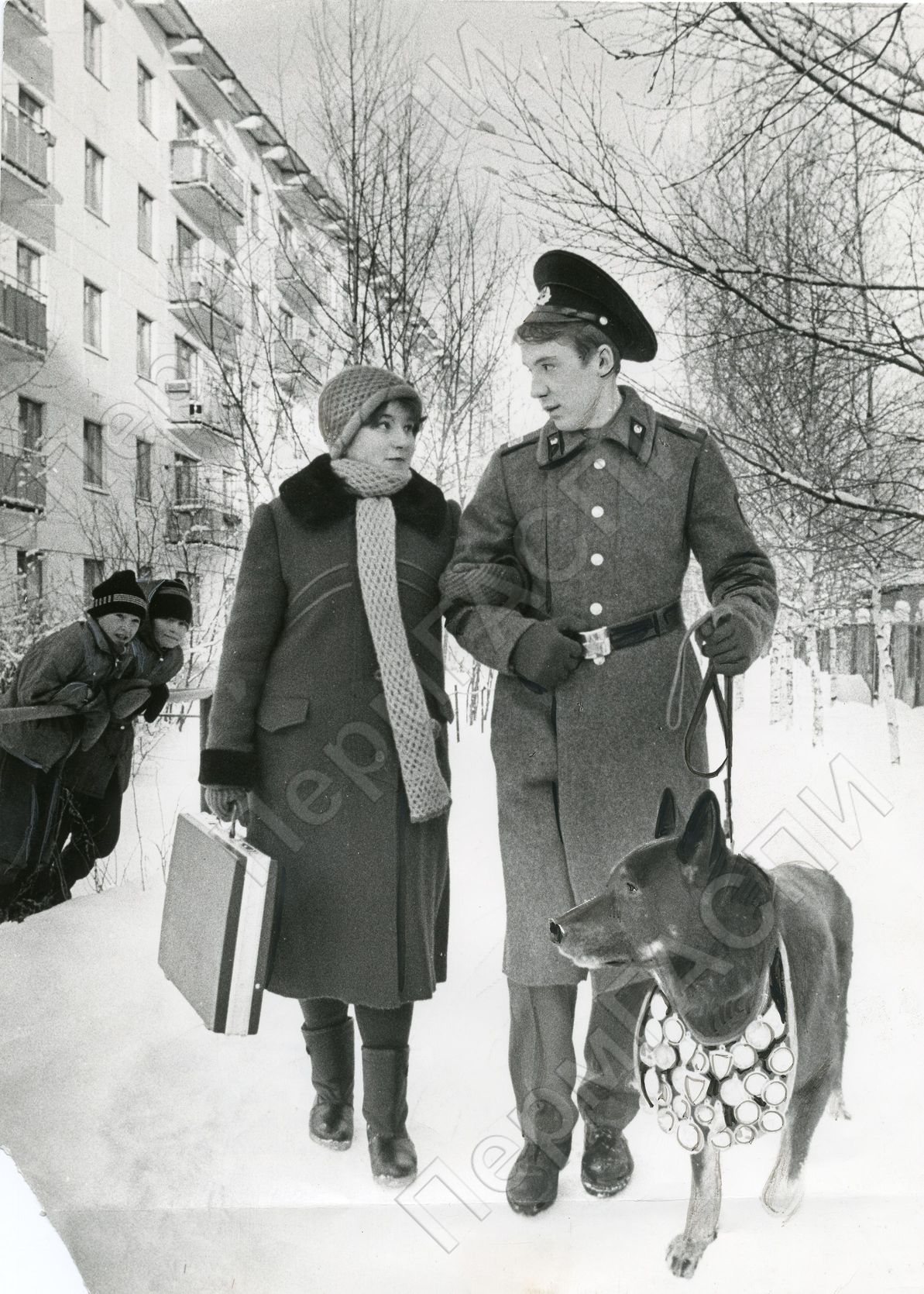 Александр Ротегов, пограничник, "Отличник погранвойск" и его сестра Ольга. Рядом овчарка Дик, служившая с ним на границе
