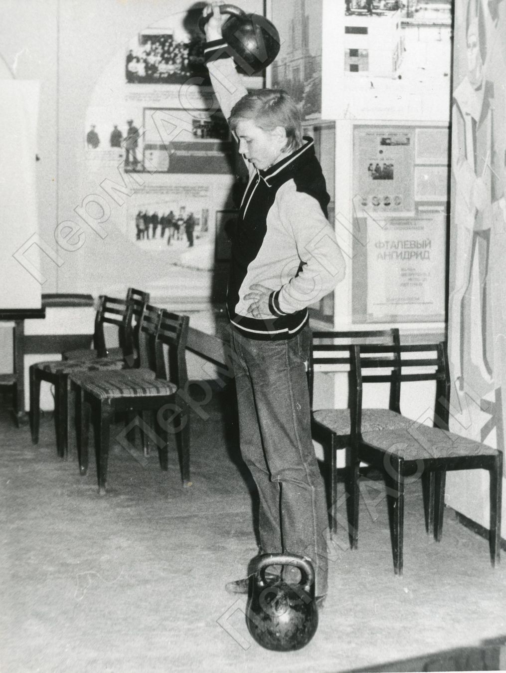 Упражнение жим 16-тикилограммовой гири одной рукой из положения на плече. Упражнение выполняет комсомолец Ещепков В.В. ДК Строителей