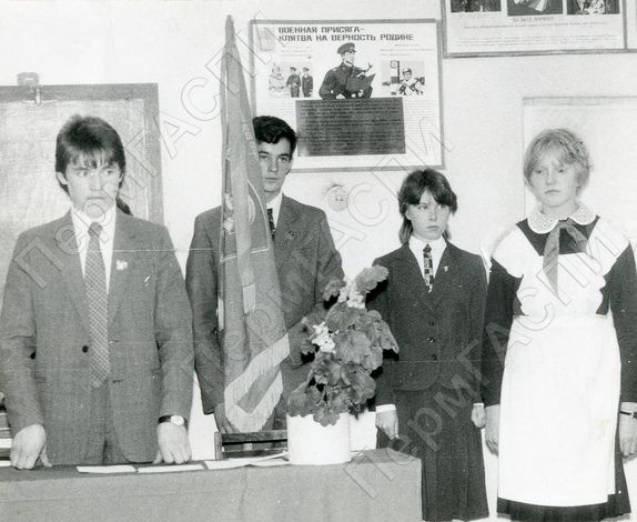 Прием в комсомол. Собрание ведет секретарь комсомольской организации Петропавловской средней школы Тихонов Владимир (слева)