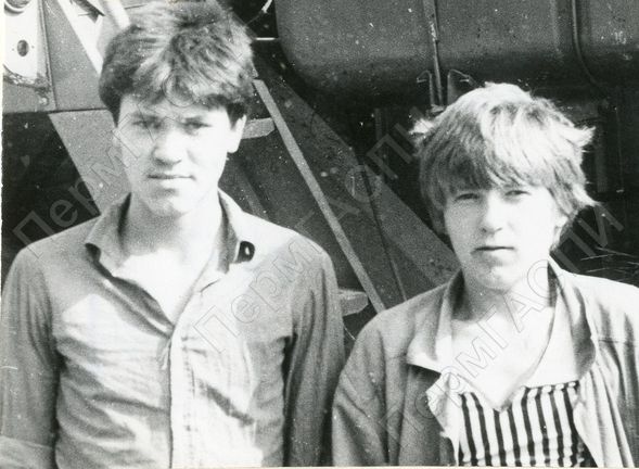 Члены комсомольско-молодежного уборочно-транспортного звена совхоза "Дзержинский" комбайнер Дементьев А.Л. (слева) и штурман Трефилов С.М.