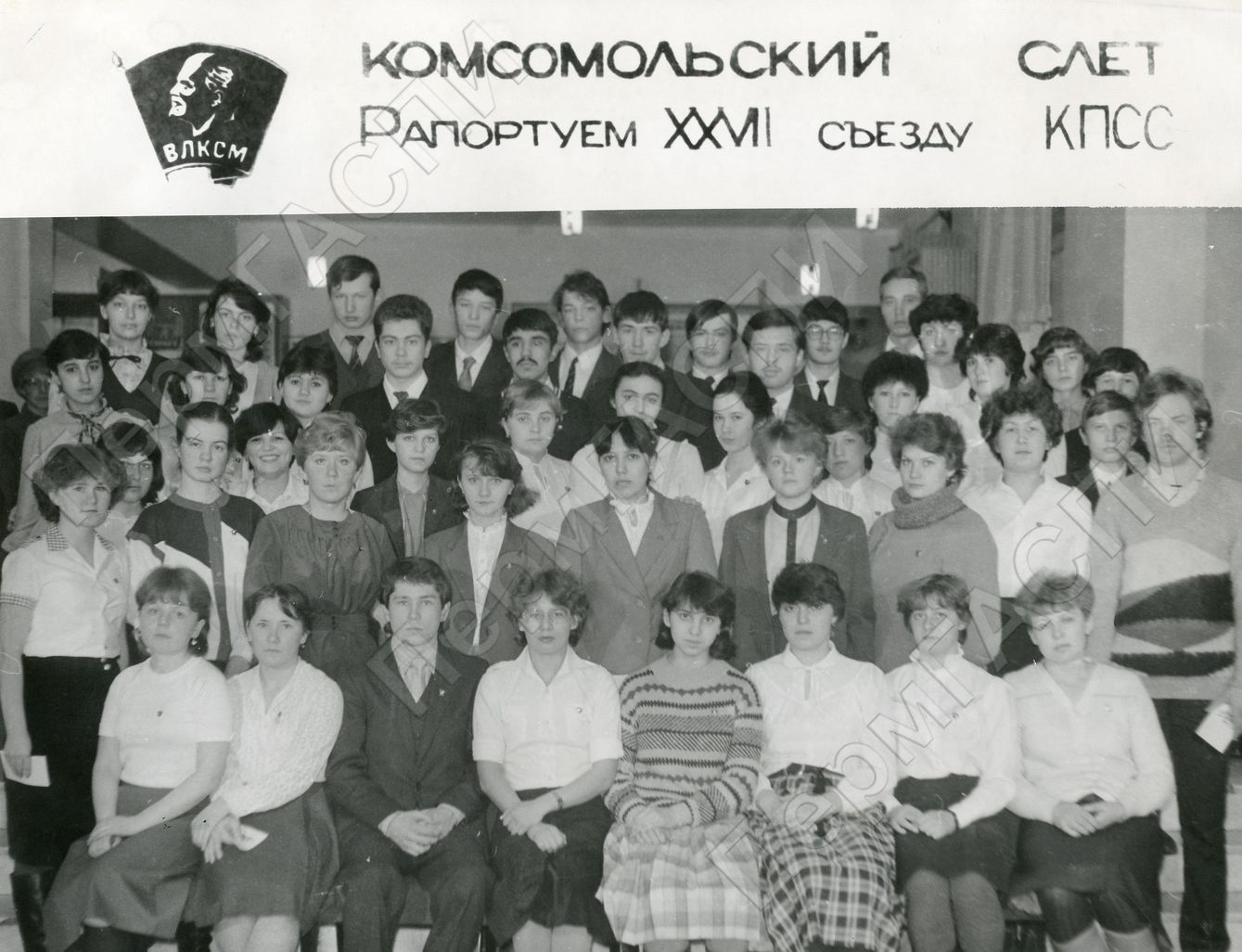 Комсомольский слет "Рапортуем XXVII съезду КПСС". Делегация учащихся школ и учебных заведений