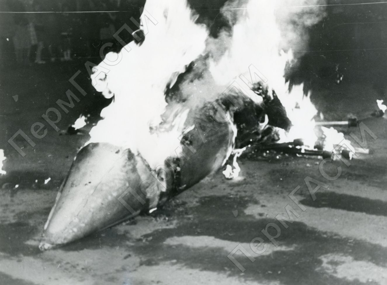 Сжигание символической ракеты на митинге в честь открытия XII Всемирного фестиваля молодежи и студентов в Москве.