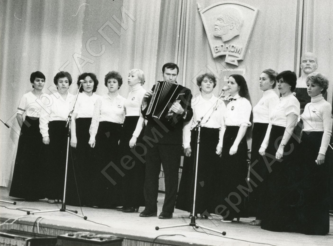 Фестиваль комсомольско-молодежной песни и политплаката, посвященный 65-летию со дня рождения комсомола. Выступление коллектива цеха 14. Клуб имени Маяковского