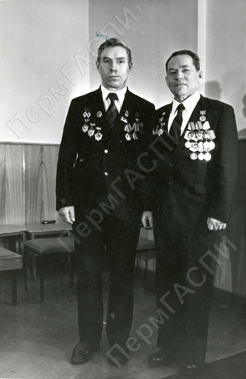 Слева направо: Меркулов Георгий Алексеевич - делегат XXIV съезда КПСС, Герой Социалистического Труда, кавалер орденов – Ленина и Трудового Красного знамени, бригадир горнорабочих очистного забоя шахты имени В.И. Ленина города Кизела. Виктор Александрович Ляпин – делегат XXVI съезда партии, первый секретарь городского комитета КПСС города Кизела.
