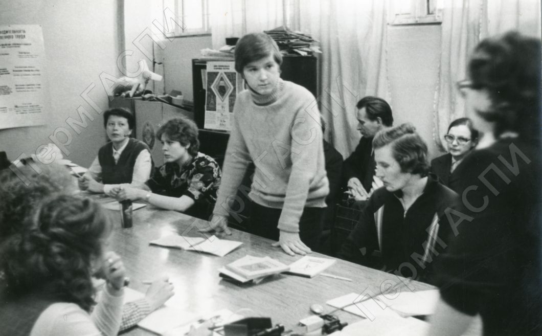 Открытое занятие системы комсомольско-политической учёбы в цехе 53. Выступает Целоусов Виктор. ПОМЗиОР. Цех 53. Красный уголок.