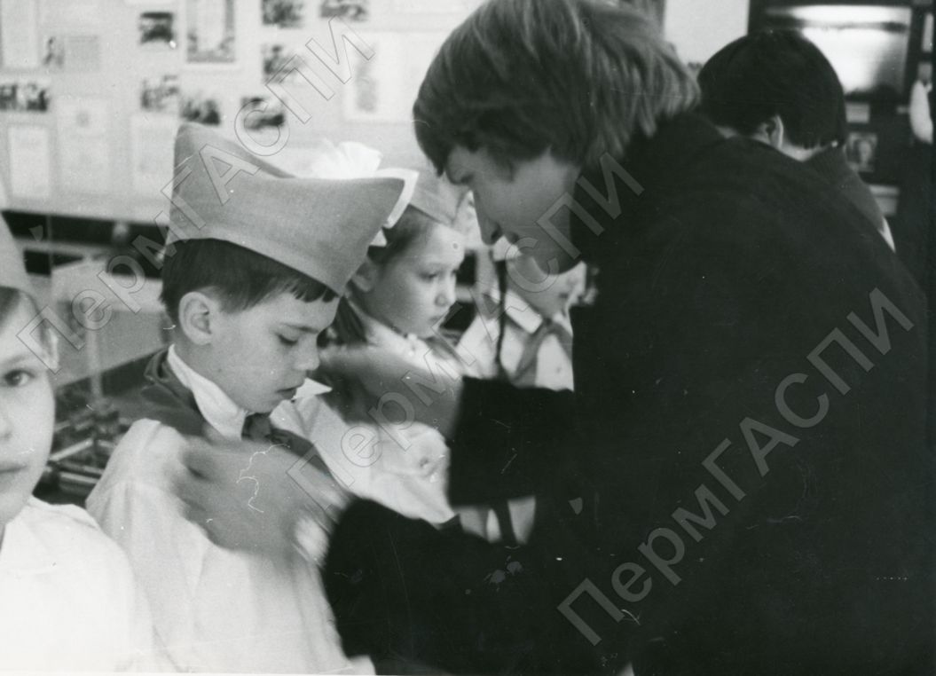 Торжественный приём в пионеры. Делегат XVIII съезда ВЛКСМ Кривошапко А. Ф. на торжественном приёме в пионеры. ПО "Машиностроительный завод им. Октябрьской революции". Музей трудовой славы объединения