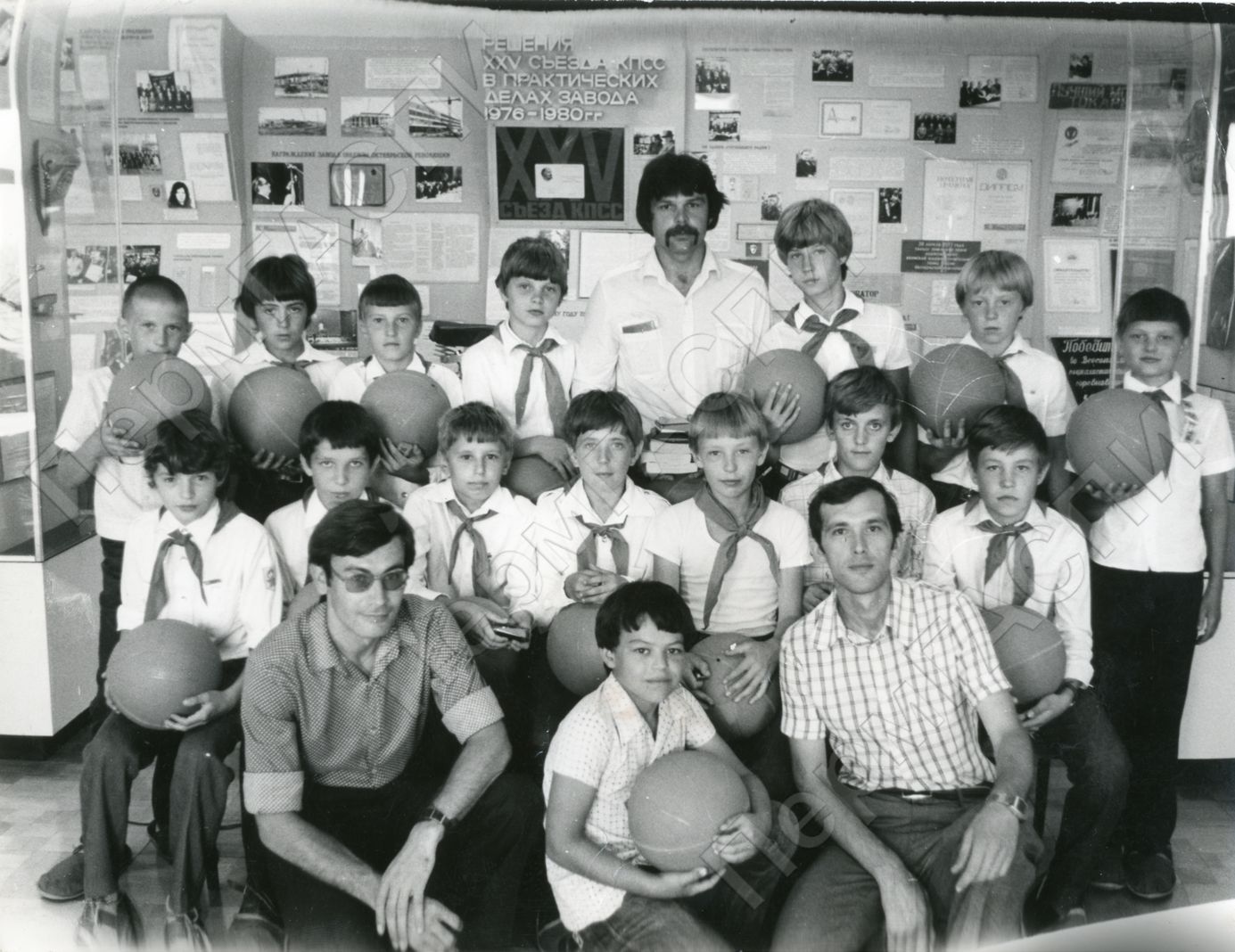 Финал Всероссийских игр на приз ЦК ВЛКСМ "Кожанный мяч". Подшефная команда "Гренада" г. Рубцовела Алтайского края в заводском музее трудовой славы. I ряд: Сунцов В. - секретарь к/о цеха 50., Седельников А.Л. - секретарь ЗК ВЛКСМ