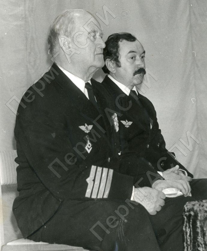 Капитан туристического теплохода "Дмитрий Фурманов" А.В. Козьмин (справа) и его отец ветеран Камского речного флота В.Т. Козьмин (слева) в здании Камского речного пароходства