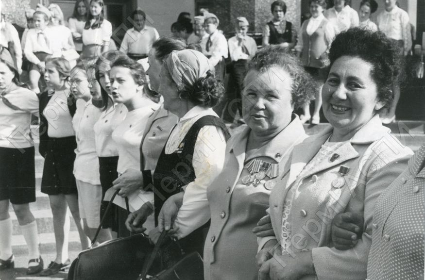 Директор Пермского областного краеведческого музея Л.Г. Дворсон (первая справа) среди ветеранов комсомола и пионеров г. Перми возле дворца культуры им. В.И. Ленина