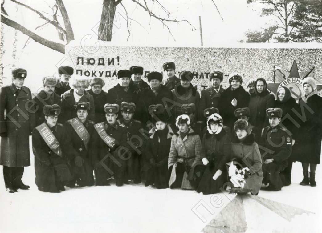 Курсанты Пермского ВАТУ им. Ленинского комсомола, ветераны В.О.В., учащиеся Сивинской СОШ у Мемориала землекам-сивинцам, погибшим в году войны, в дни работы агитационно-пропагандистского рейда Пермского обкома ВЛКСМ И Пермского ВАТУ на территории Сиыинского р-на.