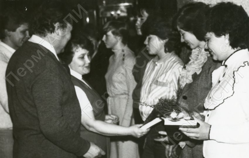 Вшивкова В. А. - наставник, машинист баш. крана дает напутстие мол. рабочим. "Посвящение в рабочий класс". Кафе "Восток"