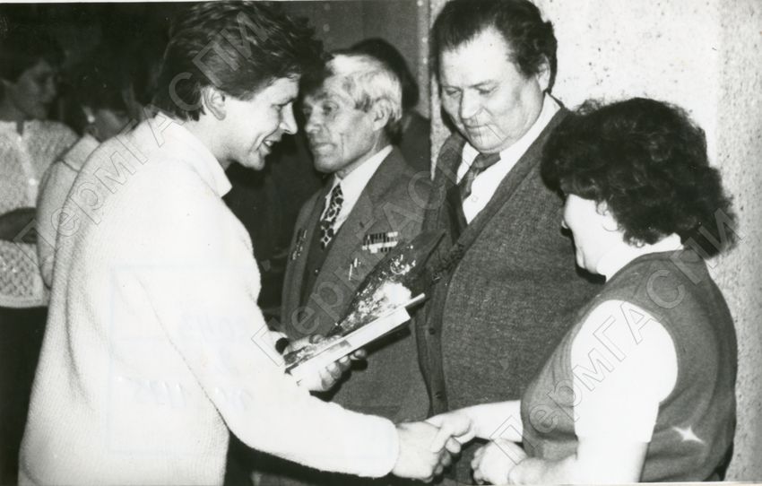 Секретарь комсомольской организации треста КПД Титов С. вручает памятные подарки наставникам молодых рабочих. Вечер "Посвящение в рабочий класс". Кафе "Восток"