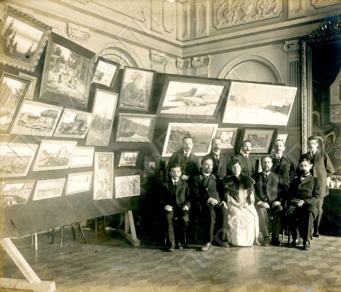 Пермские художники в одном из помещений Кирилла Мефодиевского училища. Сидят: Лопатин, Серов, Григорьева, вице Губернатор, Николаев. Стоят: Мамаев, .., Мамаев, Федоров, Пономарев.