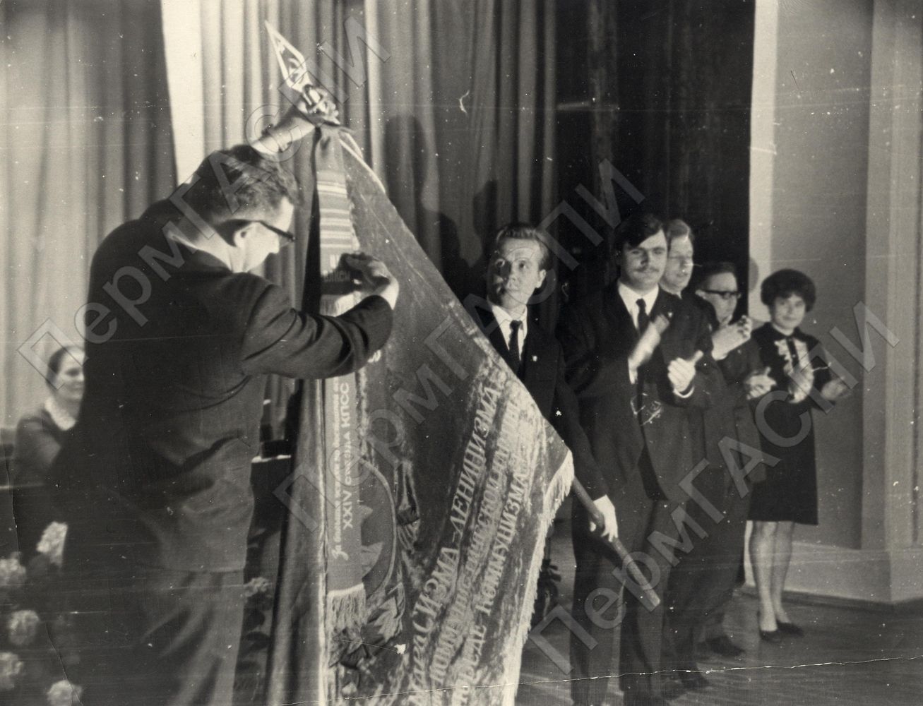 I-й секретарь обкома ВЛКСМ Шестов прикрепляет к городскому знамени Краснокамской организации памятную ленту ЦК ВЛКСМ. Знамя держит I-й секретарь Краснокамского ГК ВЛКСМ Круглов Виктор Сергеевич