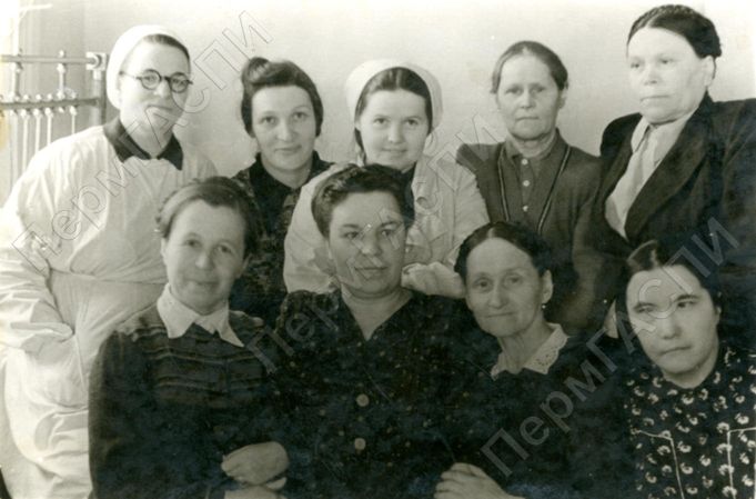 А.А. Куколева (третья слева во втором ряду) в группе сотрудников санатория "Подснежник".