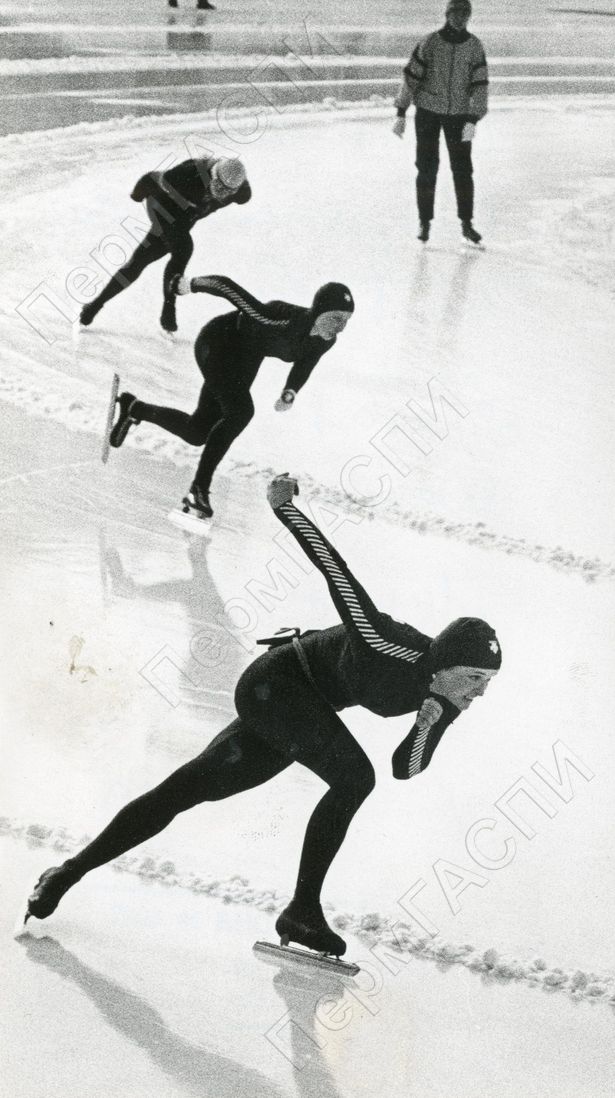 На переднем плане чемпионка Спартакиады на дистанции 500 м. ленинградка Т. Денисова. IX зимняя Спартакиада народов РСФСР
