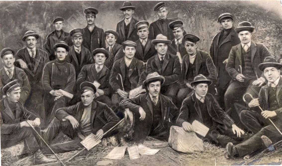 Маевка у белого камня. Чусовая. Сидит последний справа Николай Марков, сидит, облокотился на пене к Шипанов Михаил Петрович, 2-й слева стоит в последнем ряду Носырев Иван Алексеевич.