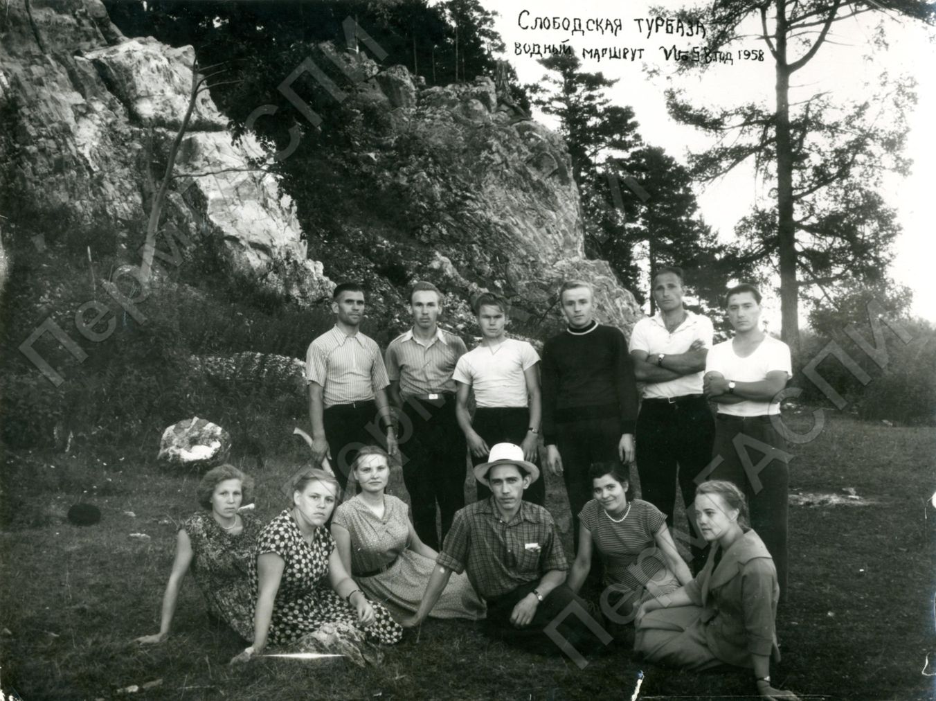 Александр Иванович Дмитриев (первый слева во втором ряду) среди участников туристического похода по р. Чусовой.