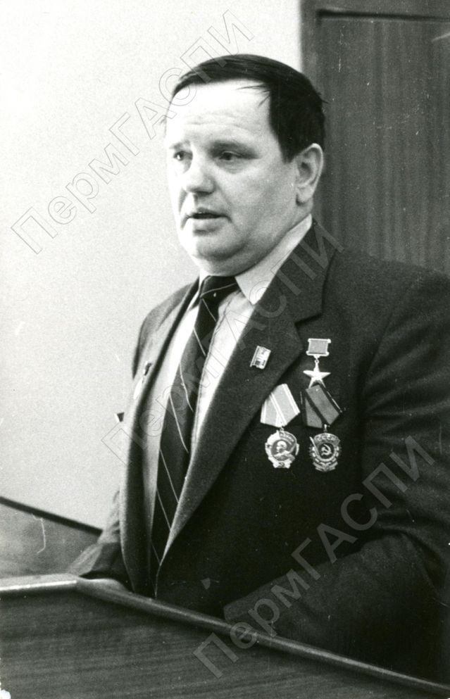 Савчук Николай Петрович - руководитель передовой бригады горняков, Герой Социалистического труда, кавалер ордена Трудового Красного Знамени, лауреат Государственной премии, полный кавалер Знака "Шахтерская слава", член парткома объединения выступает на собрании актива.