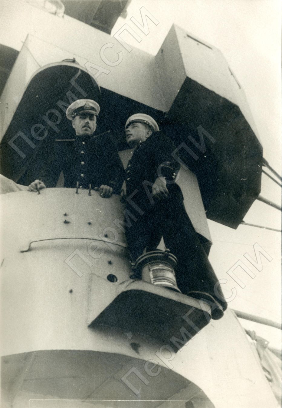 М.П. Микрюков (слева) с одним из офицеров Балтийского флота ВМФ СССР на борту линкора «Октябрьская революция».