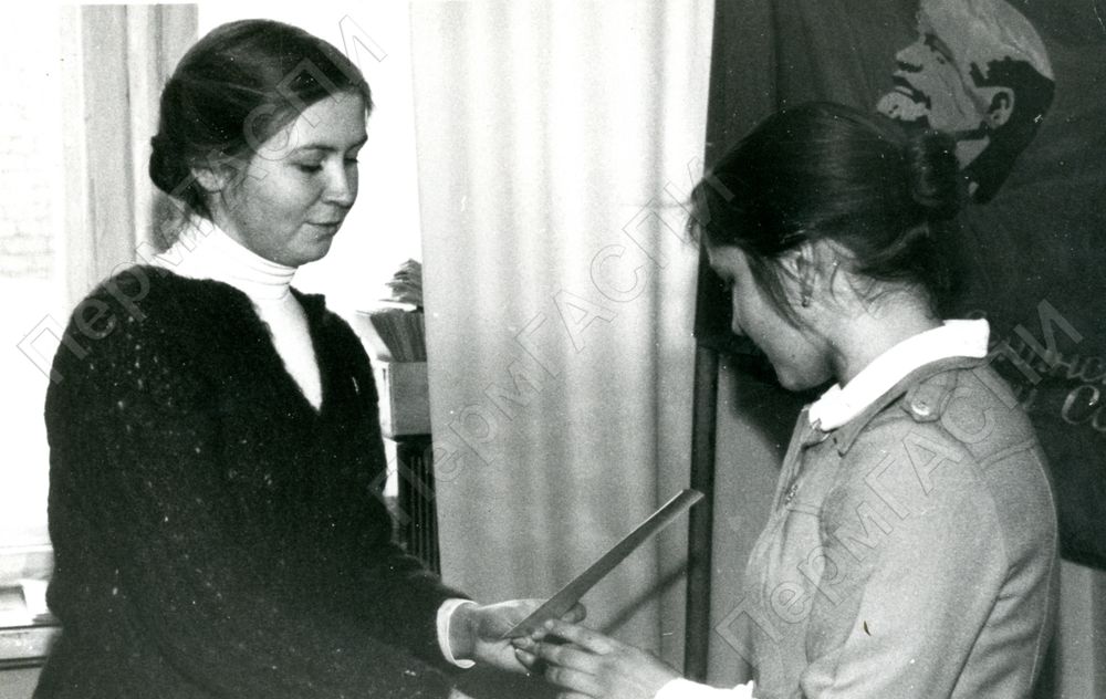 Заместитель пол организационной работе, студентка ПГПИ Урываева Марина вручает почетную грамоту. Комитет ВЛКСМ Пермского фарминститута