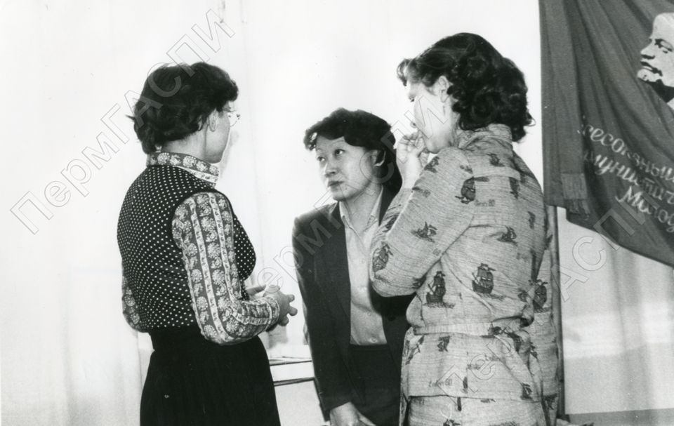 Обсуждение вопроса секретарем комитета ВЛКСМ Цой Н. (в центре), зам. секретаря по идейно-воспитательной работе Малковой Т., отв. за культурно-массовую работу Кружко М. (слева). Комитет ВЛКСМ Пермского фарминститута