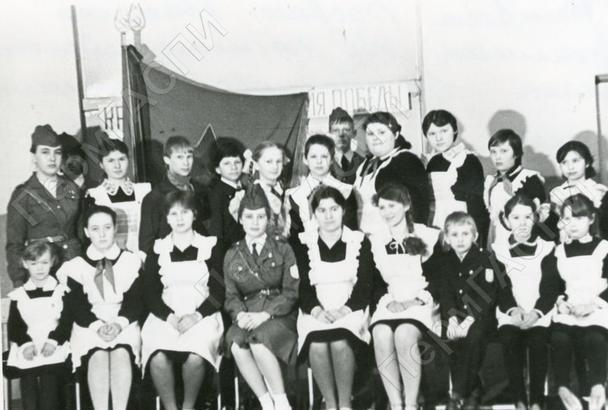 Учащиеся Усольской средней школы № 1, удостоенные права быть сфотографированными у Боевого Красного Знамени