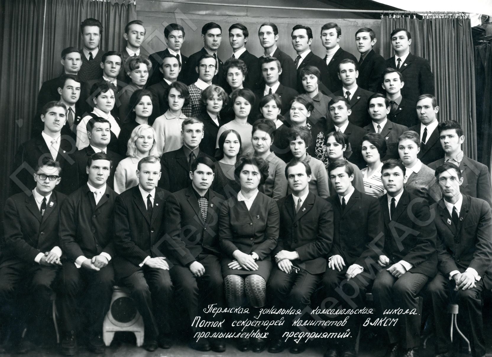 Пермская зональная комсомольская школа. Поток секретарей комитетов ВЛКСМ промышленных предприятий. Первый ряд сидят: Гильмутдинов И.Я., 5-я Орачева Е.А., Котов В.В.