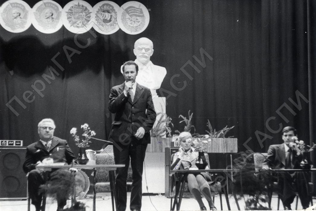 Вечер, посвященный 59-й годовщине Ленинского комсомола, Завод Камкабель. На сцене: Колышев В.И - ветеран комсомола, Мехоношин В.Б. - секретарь парткома завода, Лузина Н. - передовая рабочая цеха №14, Невоструев Н.А - секретарь комитета ВЛКСМ