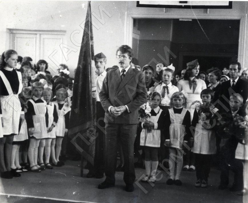 Секретарь комитета ВЛКСМ Камского кабельного завода А.В.Торхов выступает в подшефной школе № 46 в день последнего звонка.