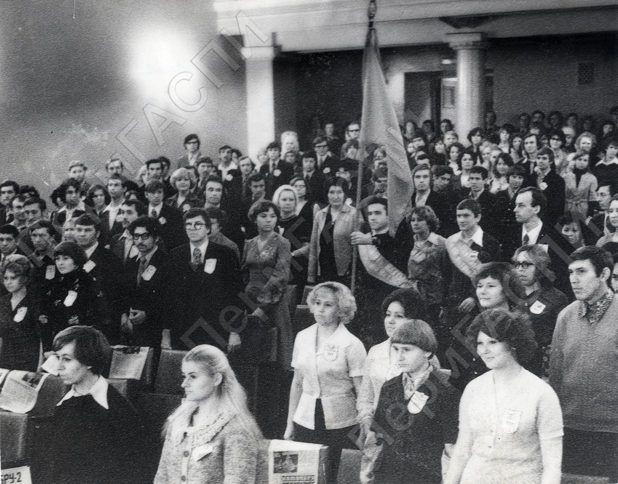 Отчетно-выборная комсомольская конференция объединения Уралкалий. ДК калийщиков. Знамя несет Батюков Геннадий Павлович - секретарь комсомольской организации рудника 1-го рудоуправления