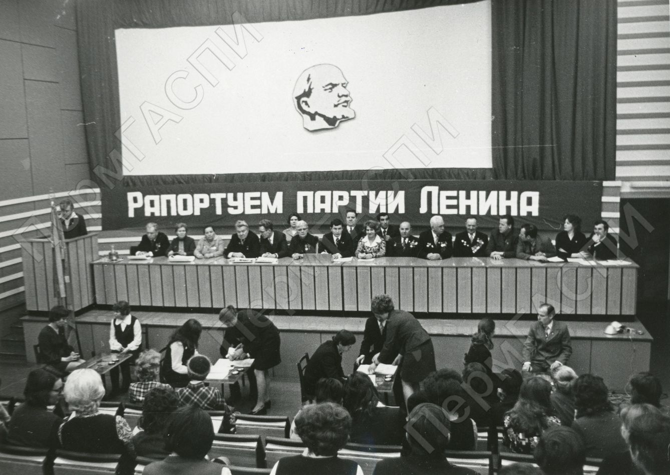 Подписание рапорта 25 съезду КПСС. На трибуне: Некрасов В., зав. орг. отделом ЦК ВЛКСМ. В президиуме: 5) Вагин Р.А., секретарь ЦК ВЛКСМ 7) Новикова, ветеран комсомола 8)Зайцев В., секретарь ЦК ВЛКСМ 10) Вострецова В., секретарь ЦК ВЛКСМ 11)Осадчий А., секретарь ЦК ВЛКСМ 12) Котенко М.А., ветеран комсомола 13) Кобелев А.С., ветеран комсомола 14)Алексеев А.М., ветеран комсомола 18)Пастухов А., секретарь комитета ВЛКСМ объединения "Уралкалий".