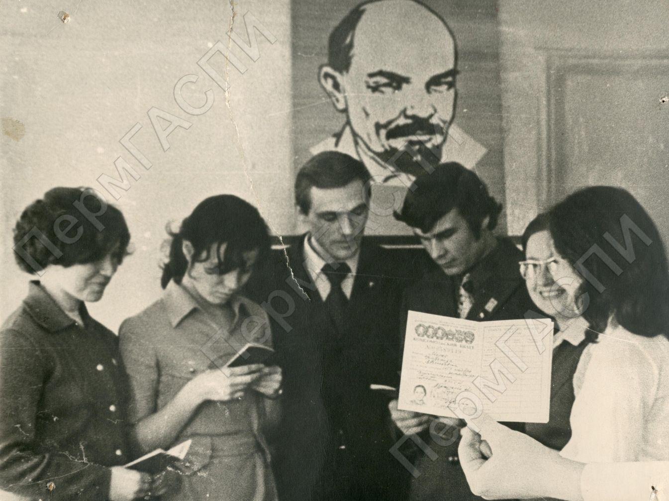 Кунгурский горком комсомола. Первый день обмена комсомольских документов. 2) Мариничева Светлана, швея фабрики индивидуального пошива и ремонта одежды 3) Жариков Николай Георгиевич, первыйсекретарь Кунгурского горкома ВЛКСМ 4) Третьяков Александр, шофер грузового автотранспортного предприятия 5) Липина Надежда, экономист райно 6) Мухо Надежда Евгеньевна, учащаяся педагогического училища