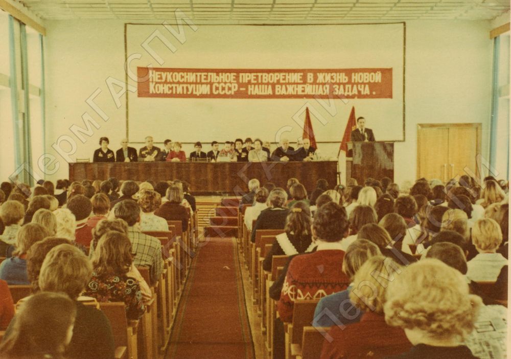 Торжественное собрание Кунгурской городской комсомольской организации, посвященное подписанию Рапорта Ленинского комосомола ЦК КПСС к 60-летию Великого Октября. Сдокладом выступает первый секретарь Кунгурского горкома ВЛКСМ Седухин Юрий Николаевич.