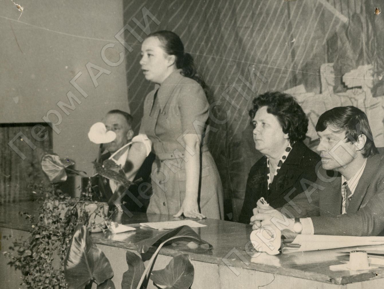 Президиум торжественного собрания, посвященного первому дню обмена комсомольских документов в Кунгурском автотранспортном техникуме. 2) Лобанова Людмила Арсентьевна, второй секретарь Кунгурского горкома ВЛКСМ 3) Катыгина Лилия Анатольевна, заслуженная учительница РСФСР 4) Шулепов Леонид Андриянович, председатель бюро международного молодежного туризма "Спутник" Пермского обкома ВЛКСМ