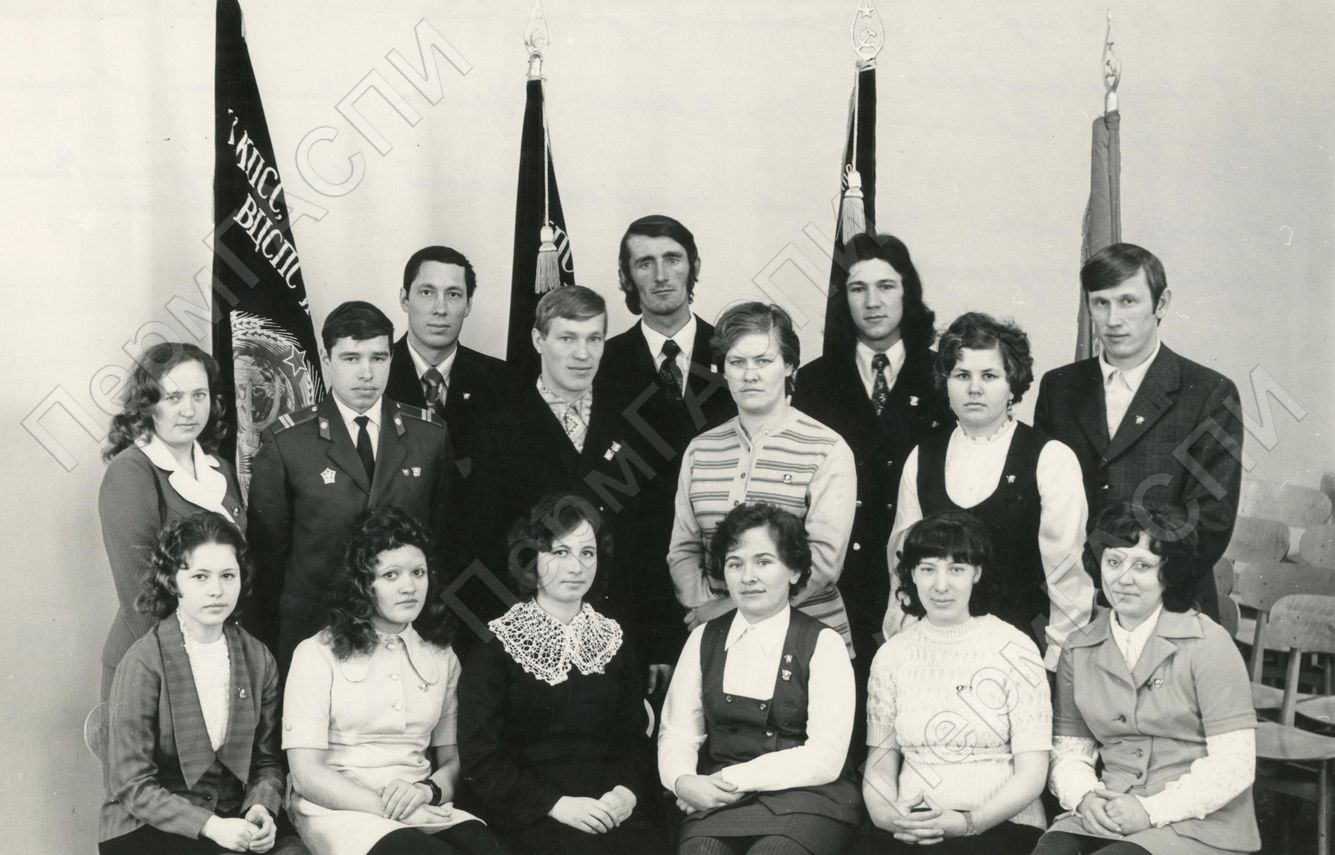 Пермский райком ВЛКСМ. Подписание рапорта ХХV съезду КПСС. 1-й ряд: 3) Гладкова Надежда, секретарь ком. организации райкома 3-й ряд: 4) Щукин Валерий Александрович, 1-й секретарь Пермского РК ВЛКСМ