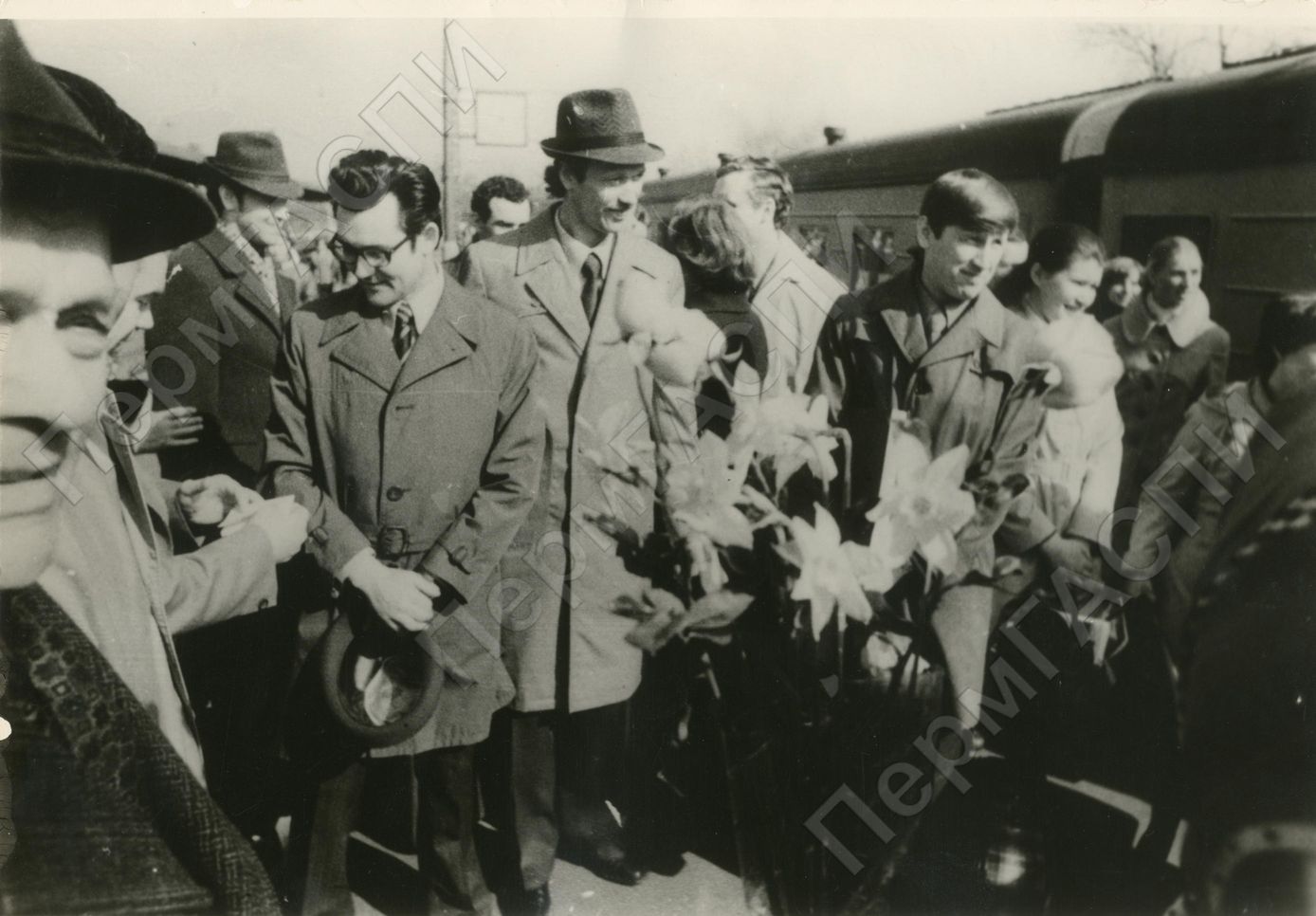 Делегаты на ХVIII съезд ВЛКСМ от Пермской областной комсомольской организации. Встреча делегации в Москве на вокзале. В центре(слева направо): Ермолов Валентин Митрофанович - 1-й секретарь обкома ВЛКСМ, Фомичев Александр Александрович - 2-й секретарь обкома ВЛКСМ, Щукин Валерий Александрович - зав. отделом рабочей и сельской молодежи обкома ВЛКСМ.