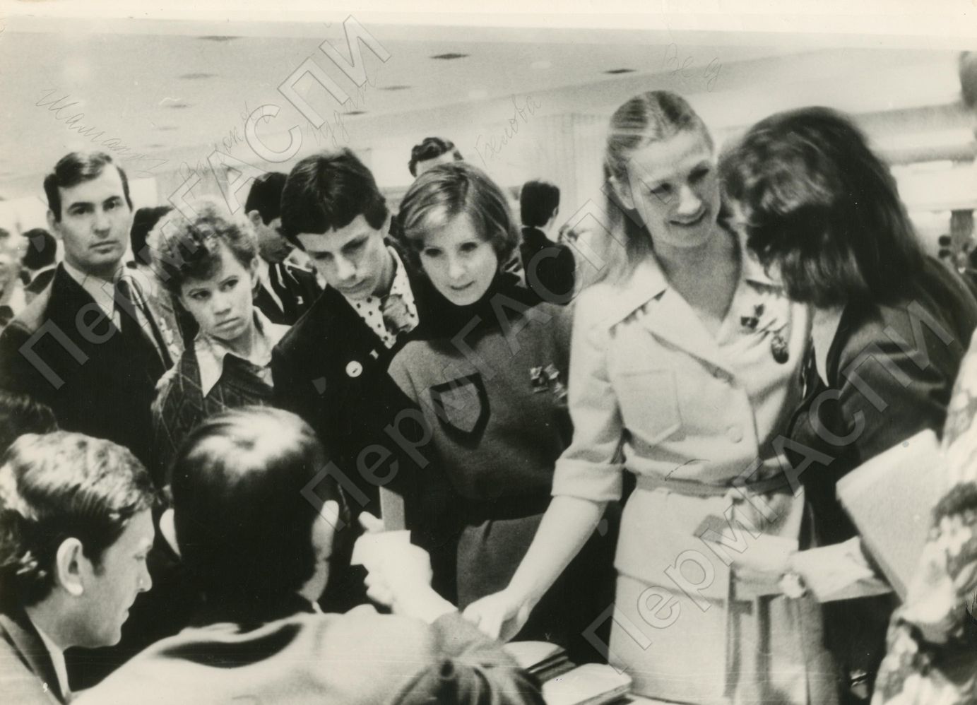 Делегаты на ХVIII съезд ВЛКСМ от Пермской областной комсомольской организации. Слева направо: Шаманов Альберт Борисович - высокомонтажник управления буровых работ нефтегазодобывающего управления "Чернушканефть", Высокова Надежда Гавриловна - заведующая фермой колхоза "Путь Ленина" Осинского р-на, Гудин Сергей Николаевич - учащийся школы №11 г. Кизела, Белова Валентина Владимировна - товаровед 1-го горпромторга г. Пермь, Веденеева Людмила Михайловна - ассистент кафедры автоматических систем управления Пермского политехнического института