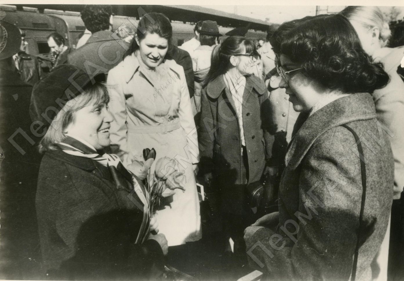 Делегаты на ХVIII съезд ВЛКСМ от Пермской областной комсомольской организации. Встреча пермской делегации на вокзале. Вторая слева - Королева Т.А. - штампавщица Пермского телефонного завода, третья слева - Мальцева В.С.
