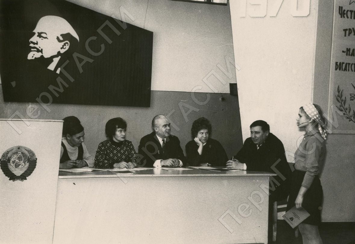 Ленинский зачет на фабрике Гознак. Пепеляева Л., секретарь ком. организации цеха 27, Одинцов Е.Г., секретарь парткома, Стряпунин П.Г., нач. цеха, Гилязетдинова Валентина. - сдает зачет.
