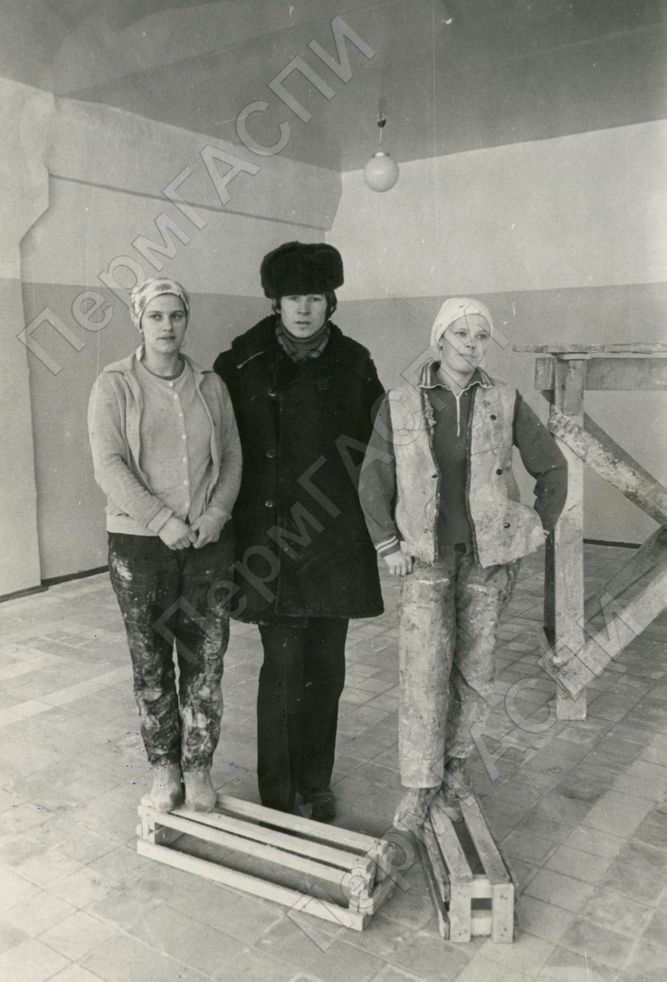 Начальник штаба областной ударной комсомольской стройки химкомпекса С. Белоусов с отделочницами стройки Чайниковой Натальей и Камениной Любой.