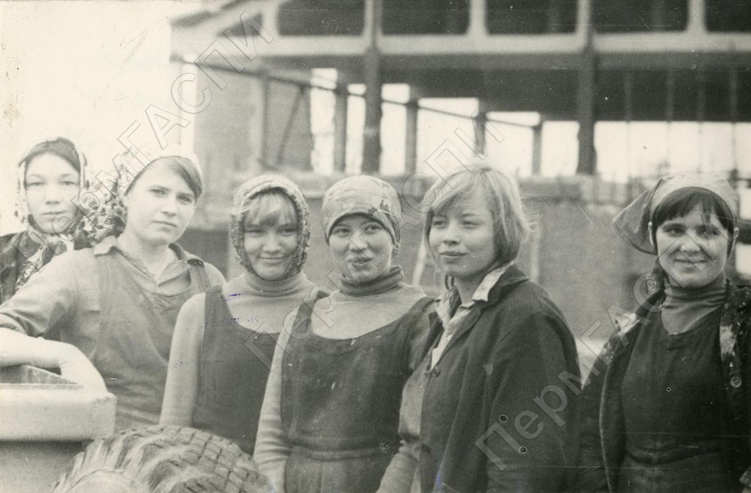 Учащиеся ПТУ треста № 7 на производственной практике. 1) Волегова Валентина 2) Крутикова Надежда 3) Песитова Антонина 4) Благиных Анна 5) Снегирева Татьяна 6) Пинаева Надежда