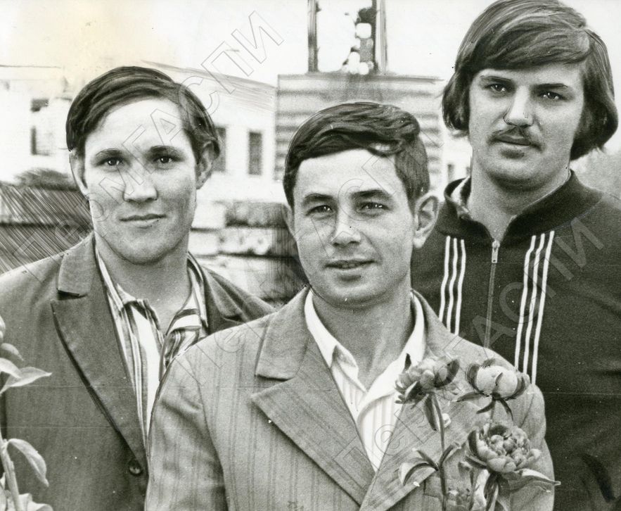 Победители в соцсоревновании "Лучший по профессии". Стройтрест № 14. Идиатуллин Ф., Сятчихин И., Титов В.