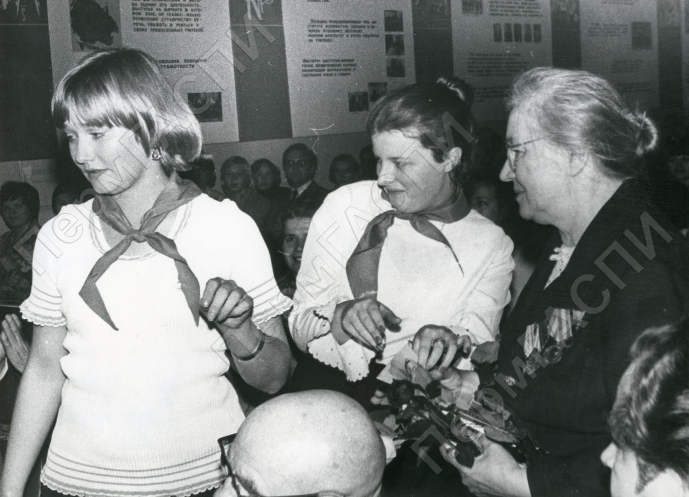Вечер, посвященный 60-летию ВЛКСМ. Бойцы педагогических отрядов вручают памятные сувениры ветерану комсомола Минацевич Елене Карловне.