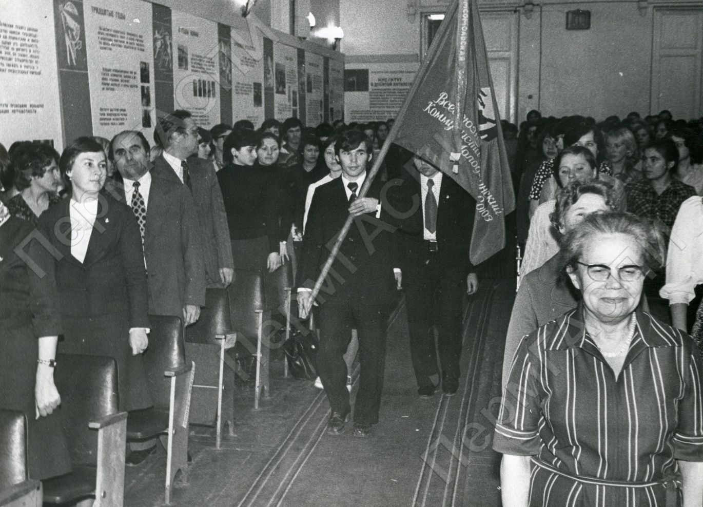 Вечер, посвященный 60-летию ВЛКСМ. Знамя комсомольской организации пединститута. Знаменосец - Юшков Владимир, Ленинский стипендиат, студент 3-го курса факультета физвоспитания, секретарь комсомольского бюро факультета, ассистенты - Колпакова Елена, член комсомольского бюро филологического факультета, Григорьев Юрий, студент биологического факультета, член комитета ВЛКСМ института.