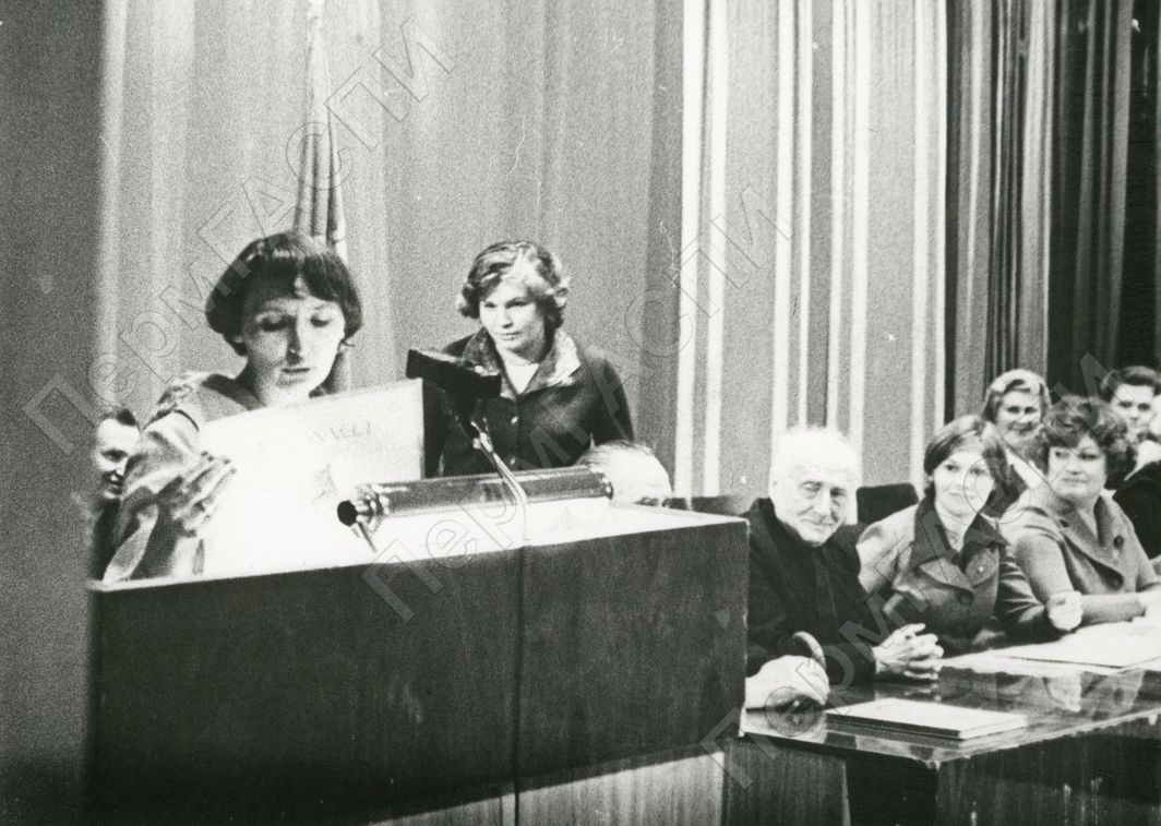 Пермское медучилище. Собрание, посвященное 60-летию ВЛКСМ. Грамоту РК ВЛКСМ за активное участия в жизни комсомольской организации вручает секретарь Ленинского РК ВЛКСМ Ваганова В., Тепловой Н., секретарю бюро медсестринского отделения.